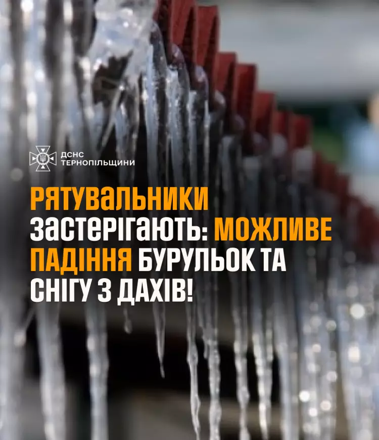 Головне управління ДСНС України у Тернопільській області наголошує: в період температурних коливань та відлиги значно зростає ризик травмування через падіння бурульок та снігових мас з дахів будинків. Лід, що тане, стає непередбачуваним і може зірватися будь-якої миті.
